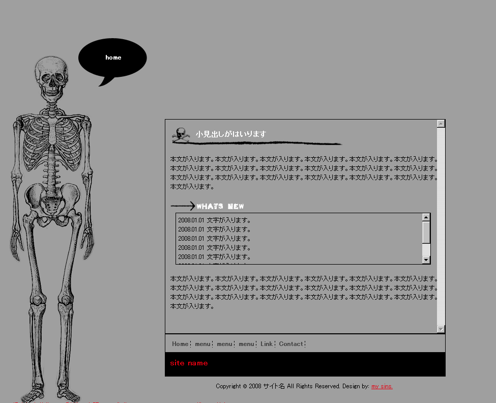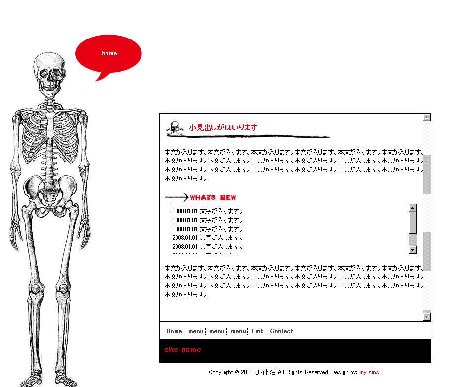 骨です(笑)。 非常に簡単なテンプレになってしまいました・・・。 本文が入る部分は、縦・横幅共固定で、自動スクロールです。 [全体図]サムネイルをクリックしてください。